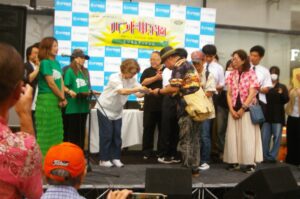 ワタシのお隣に写っているのが、審査委員長で、地元甲子園町の自治会長でもある、シンガーソングライターのムーチョさん!